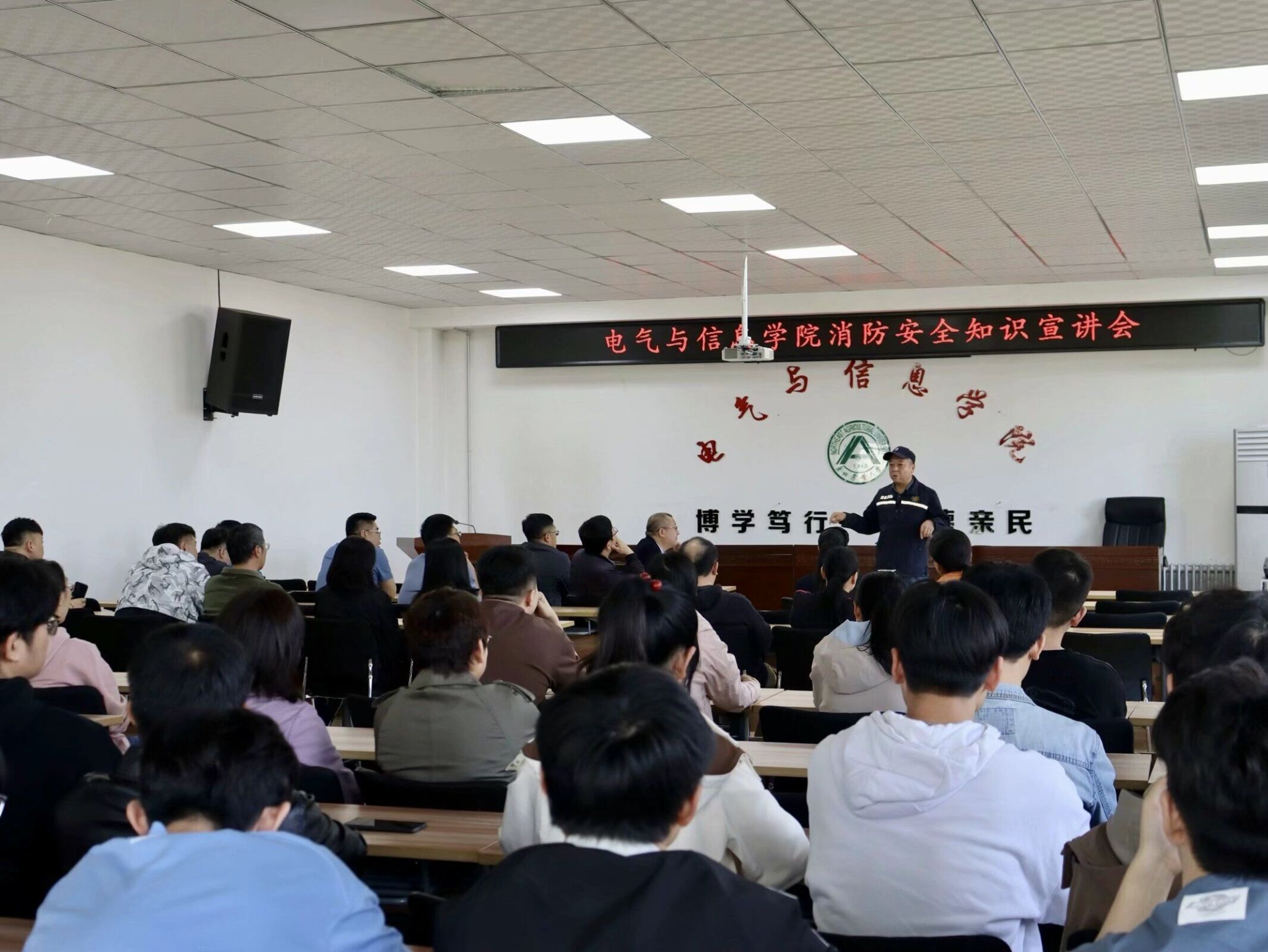 在电信楼530会议室,学校保卫处消防科科长王爱众为师生讲解了消防安全知识、楼宇安全通道情况及遇到火灾时开展安全自救的具体措施,提高了师生对消防安全的认识。