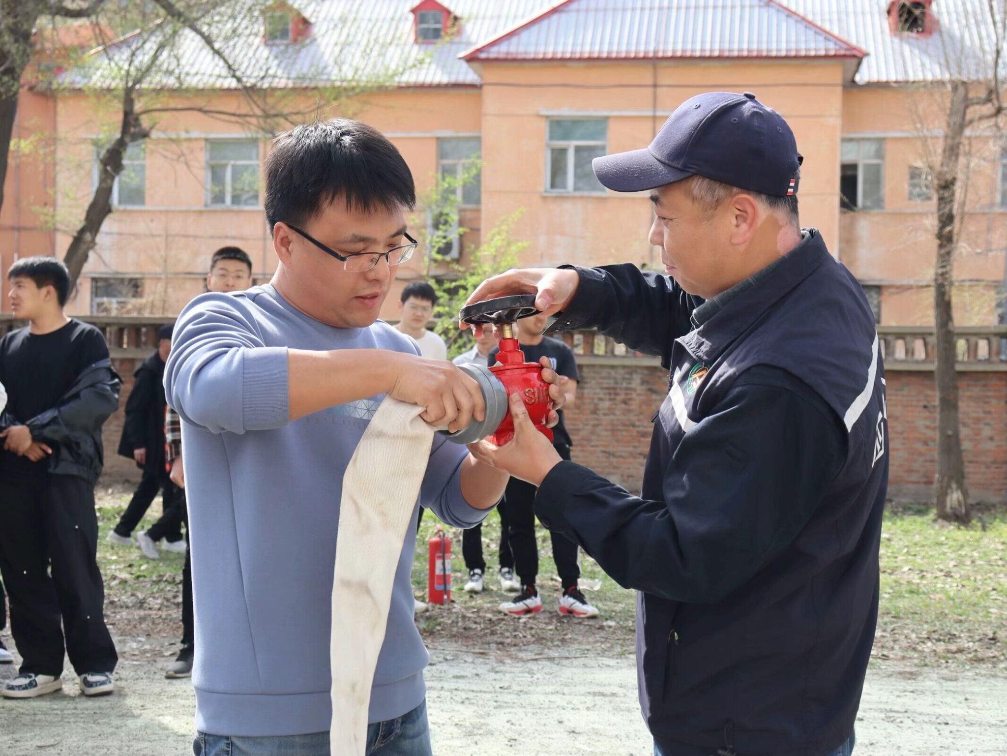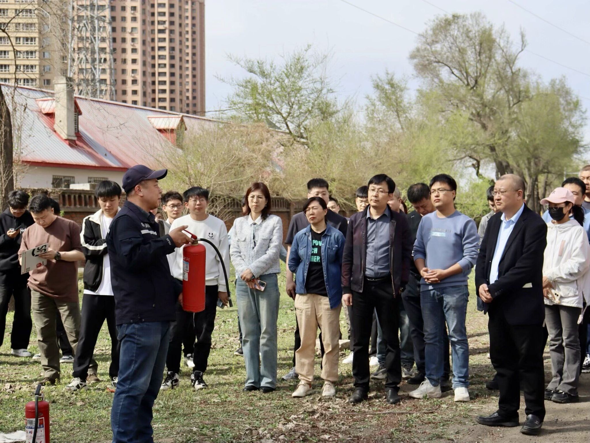 培训结束后,与会师生开展了火灾疏散演练。随着警报声响起,大家根据所学逃生知识和技巧,按照应急预案,从消防通道有序地从楼内向楼外疏散至安全区域。保卫处工作人员为师生们讲解了灭火器、消火栓、消防水带的正确使用方法及注意事项,并进行了模拟灭火演练。